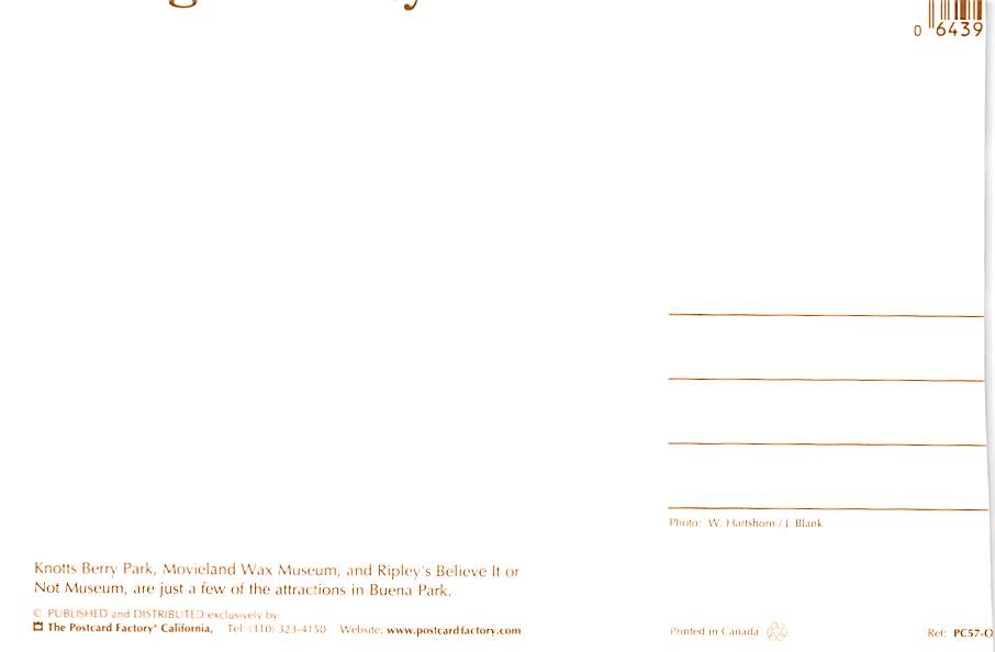 Knotts Berry Park - California Grade: 1 Category: Continental Size Postcard, Approx 4 in x 6 in (10 cm x 15.25 cm) Product Size: Continental size: 4X6 inches (10.5 cm x 15 cm) Grading Scale: Grade 1 = Perfect ... Read More