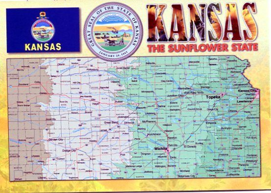 KS: KANSAS "THE SUNFLOWER STATE" MAP POSTCARD