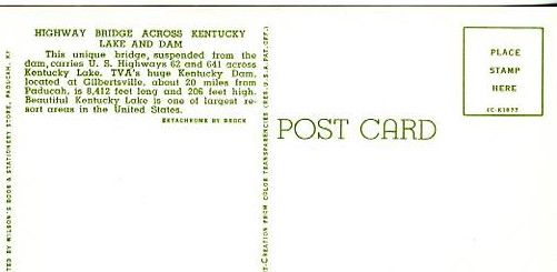 KY - Highway Bridge AcrossKentucky Lake & Dam M, Un, Db, C Grading of Postcards MINT (M): Perfect condition, no apparent blemishes, flaws, postally unused, may have some writing on back. NEAR MINT (NM): Like new, ... Read More