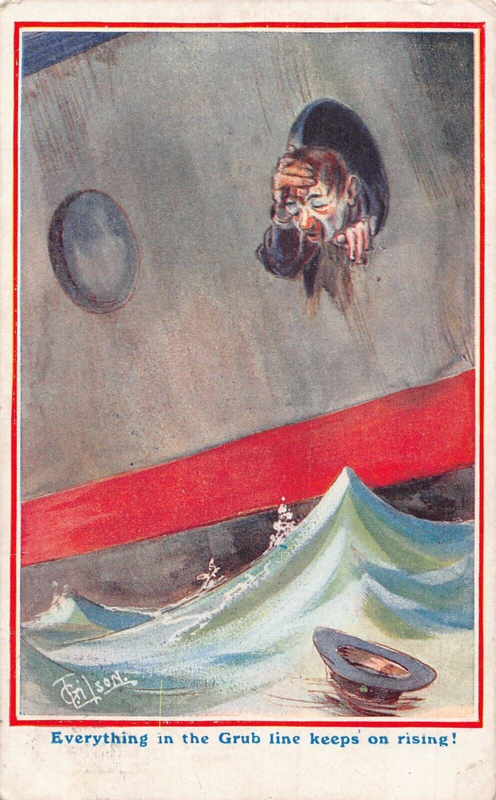 L054 Sea sick ship, everything in the Grub line keep comic humor signed postcard