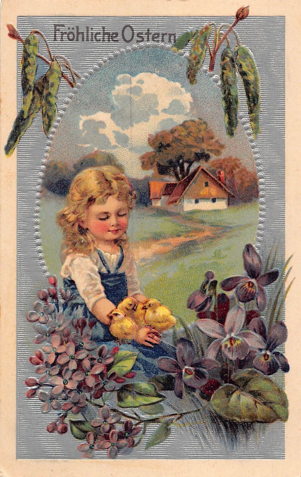L226 Easter Greetings 1911 Girl chicks flowers embossed postcard