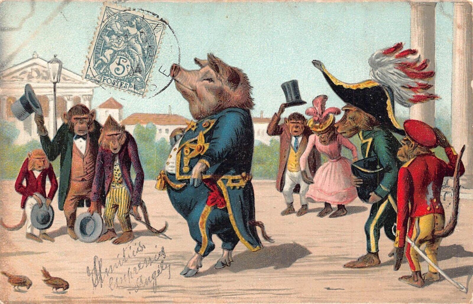 L348 Greetings 1904 Humanized Pig Monkeys anthropomorphic comic vintage postcard This item is listed via xdm.it software