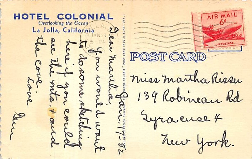 La Jolla California Postcard Postal Date: postal used unknown Grade: 1 Size: Regular Size Postcard - approximately 3 1/2 inch x 5 1/2 inch (9 CM x 14 CM) Grading Scale: Grade 1 = Perfect corners Grade 2 = Ver ... Read More
