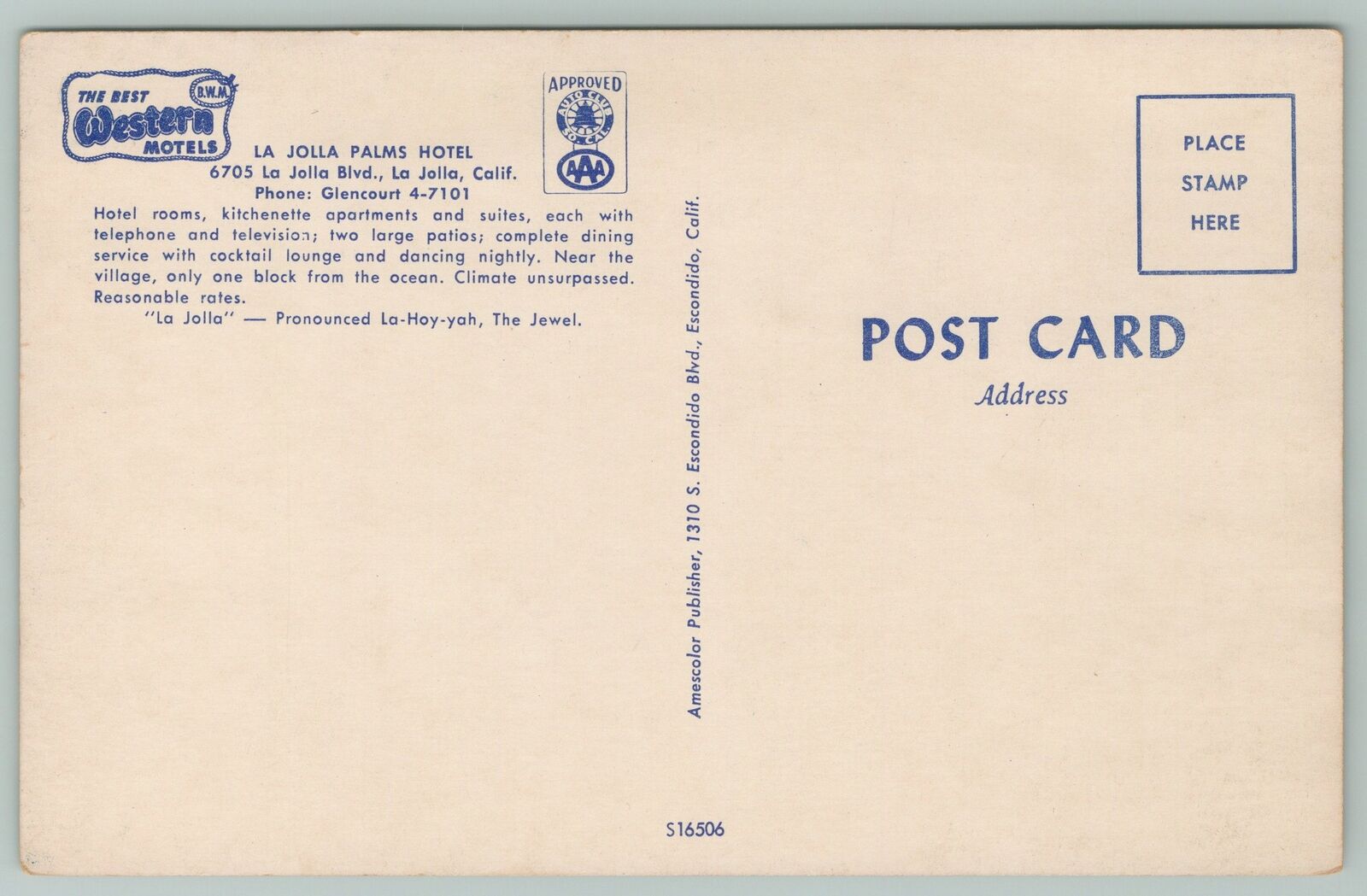 La Jolla California~Palms Hotel~Standard Chrome Postcard
