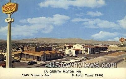 La Quinta Motor Inn - El Paso, Texas Postcard - Unused Grade: 1 Size: R - Regular size: Approx 3 1/2 X 5 1/2 inch (9 cm X 14 cm) Grading Scale: Grade 1 = Perfect corners Grade 2 = Very Minimal corner wear, no ... Read More