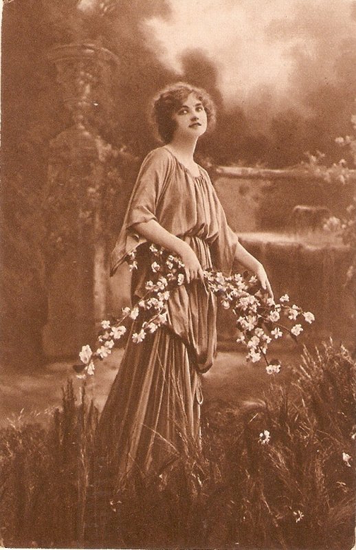 "lady carrying flower branches" old vintage postcard