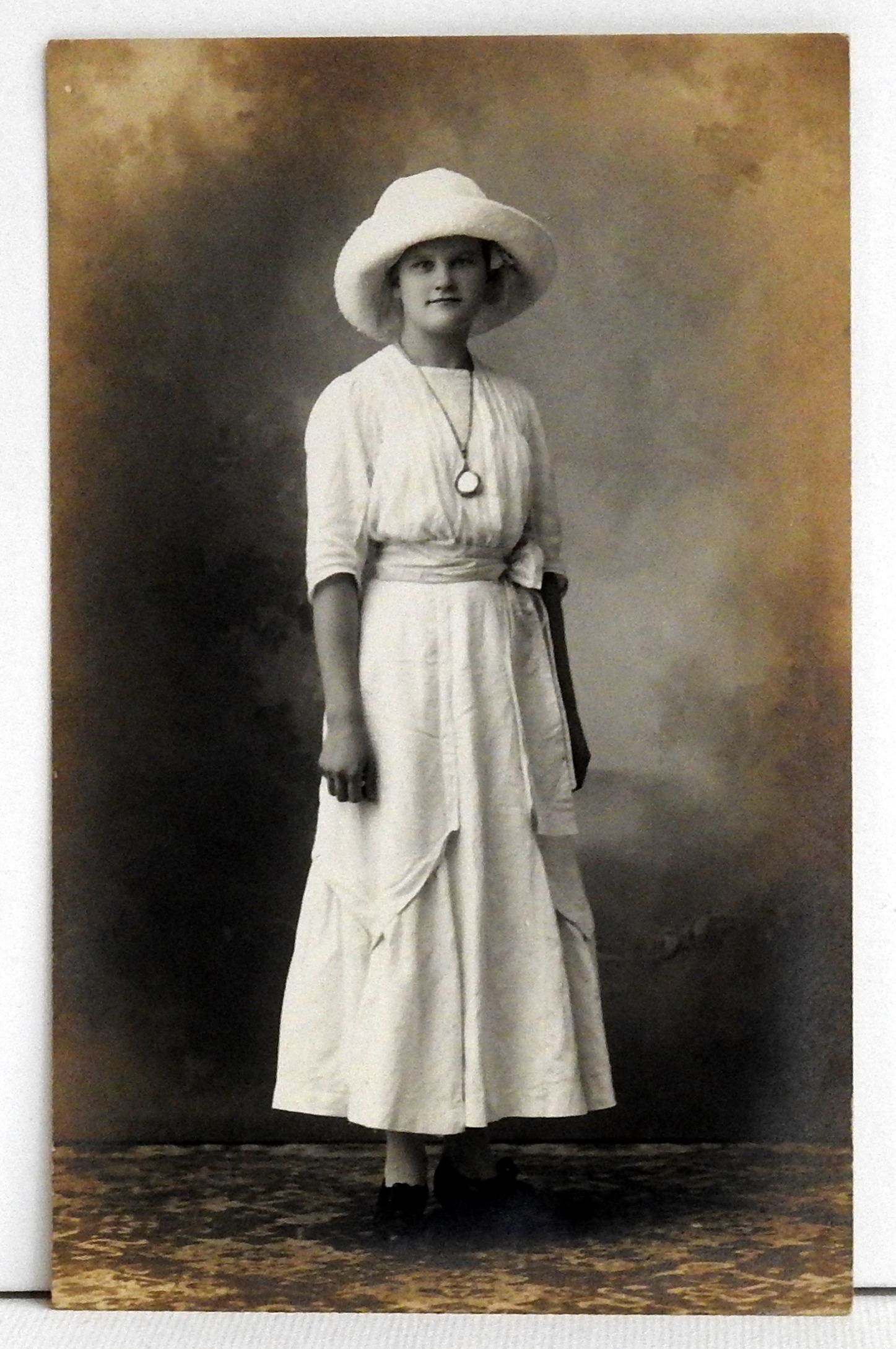 RPPC Postcard; Studio photograph of a young lady dressed in a white dress and hat; Clean and undamaged.Seller Information