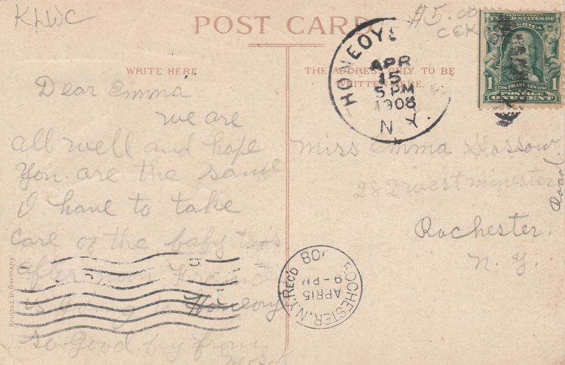 Postmarked at Honeoye Falls NY on April 15, 1908.