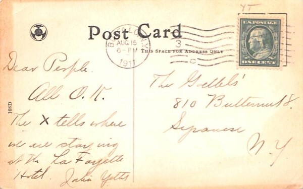 Lafayette Square Buffalo, New York Postcard - 1911 Grade: 3 Size: R - Regular size: Approx 3 1/2 X 5 1/2 inch (9 cm X 14 cm) Grading Scale: Grade 1 = Perfect corners Grade 2 = Very Minimal corner wear, no crea ... Read More