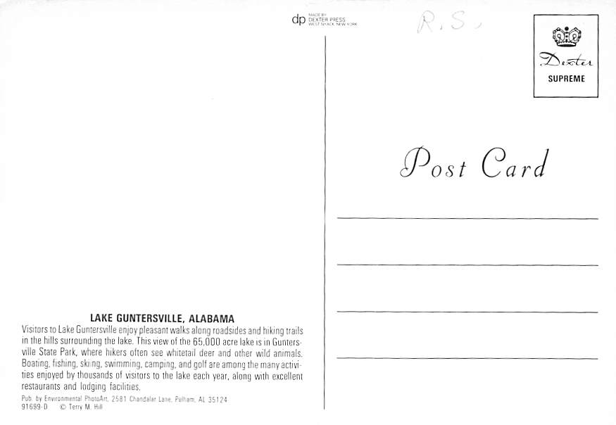 Lake Guntersville - Alabama Grade: 1 Category: Continental Size Postcard, Approx 4 in x 6 in (10 cm x 15.25 cm) Product Size: Continental size: 4X6 inches (10.5 cm x 15 cm) Grading Scale: Grade 1 = Perfect cor ... Read More
