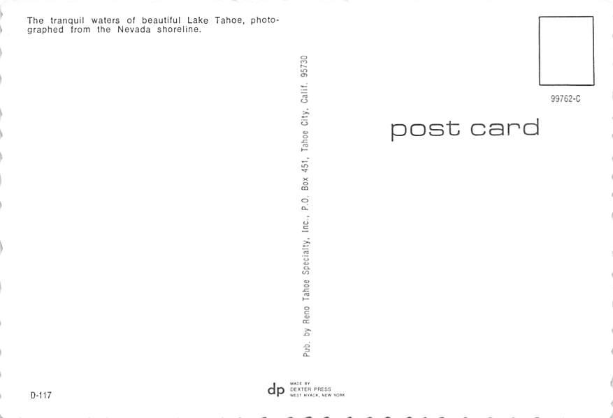 Lake Tahoe - California Grade: 1 Category: Continental Size Postcard, Approx 4 in x 6 in (10 cm x 15.25 cm) Product Size: Continental size: 4X6 inches (10.5 cm x 15 cm) Grading Scale: Grade 1 = Perfect corners ... Read More