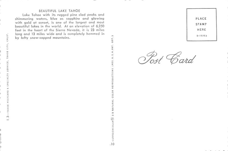 Lake Tahoe - California Grade: 1 Category: Continental Size Postcard, Approx 4 in x 6 in (10 cm x 15.25 cm) Product Size: Continental size: 4X6 inches (10.5 cm x 15 cm) Grading Scale: Grade 1 = Perfect corners ... Read More