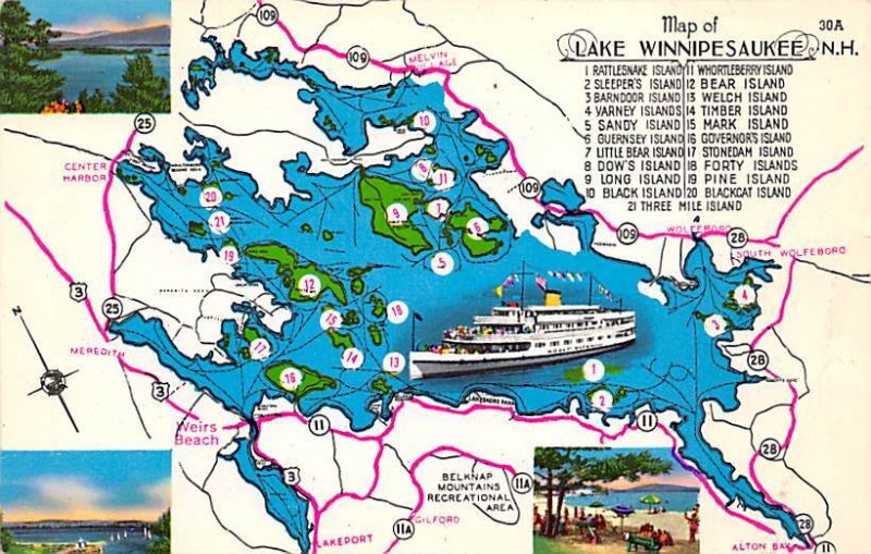 Lake Winnipesaukee, NH, USA Map Postcard Unused,