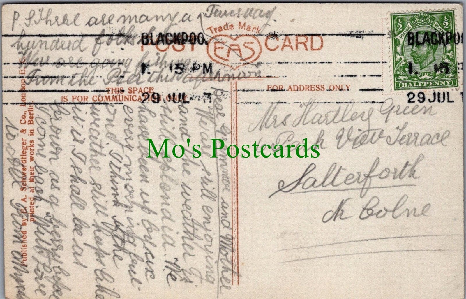 This is a postcard of Talbot Square, Blackpool, LancashirePublisher: E.A.Schwerdtleger & Co Postcard size: Non standard. Posted in 1913 If a postcard has any obvious defects they will be mentioned within this product description. Please use our image magnifier to make your own assessment on the condition.Postcard defect(s) : All of our postcards are posted to you inside a plastic sleeve and a board backed envelope which will be marked 'Please do not bend'. The 'Mo's Postcards' watermark does not appear on the actual postcard'.Mo's Ref No: SW8934 for Talbot Square, Blackpool, Lancashire