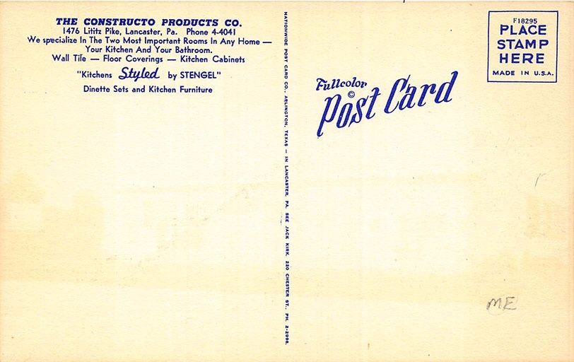 Condition: PLEASE SEE SCANS FOR CONDITION. Lancaster PA Constructo Products, for your Kitchen, Bathroom, located at 1476 Litits Pike. Please see Scan(s) for condition. Click here for more Postcards. Please see shi ... Read More