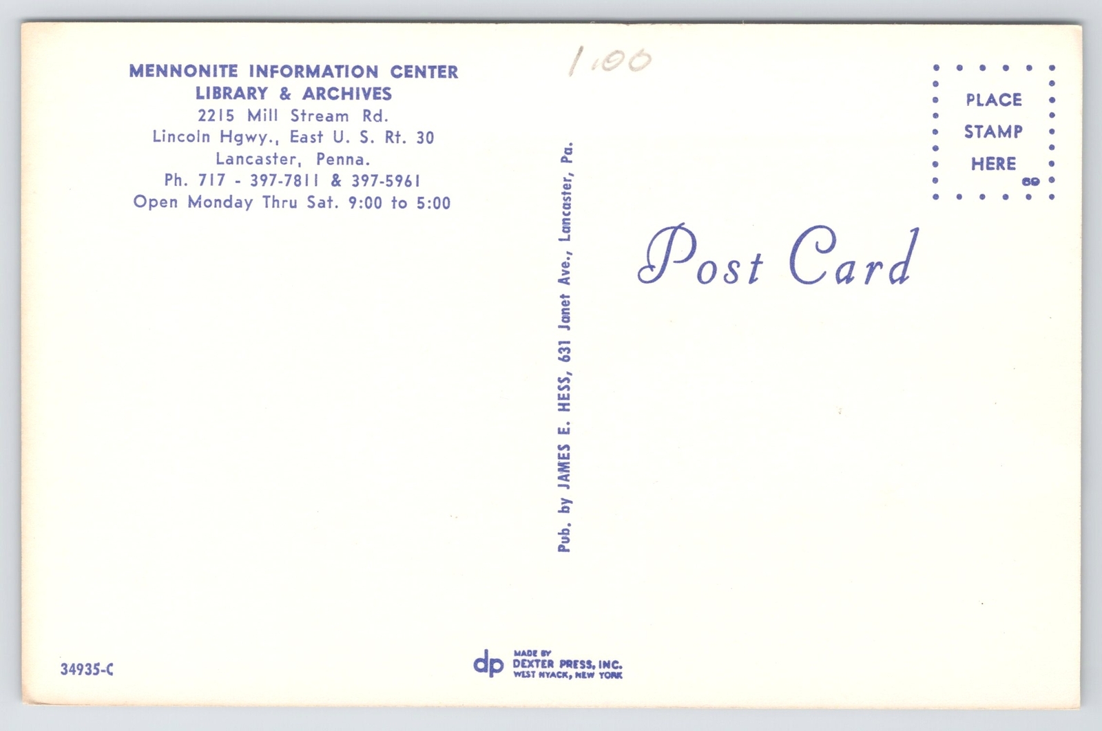 Lancaster PA~Mennonite Information Center Library & Archives~Vintage Postcard