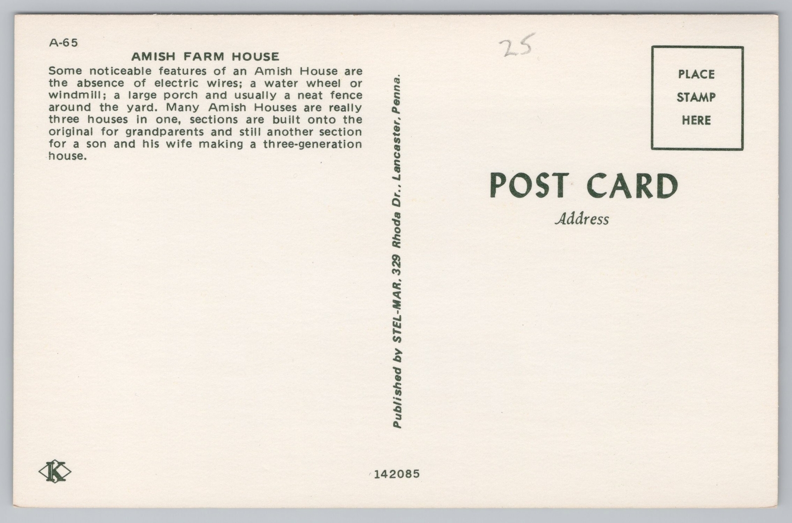 Lancaster Pennsylvania~Amish Farm House~Windmill~Vintage Postcard