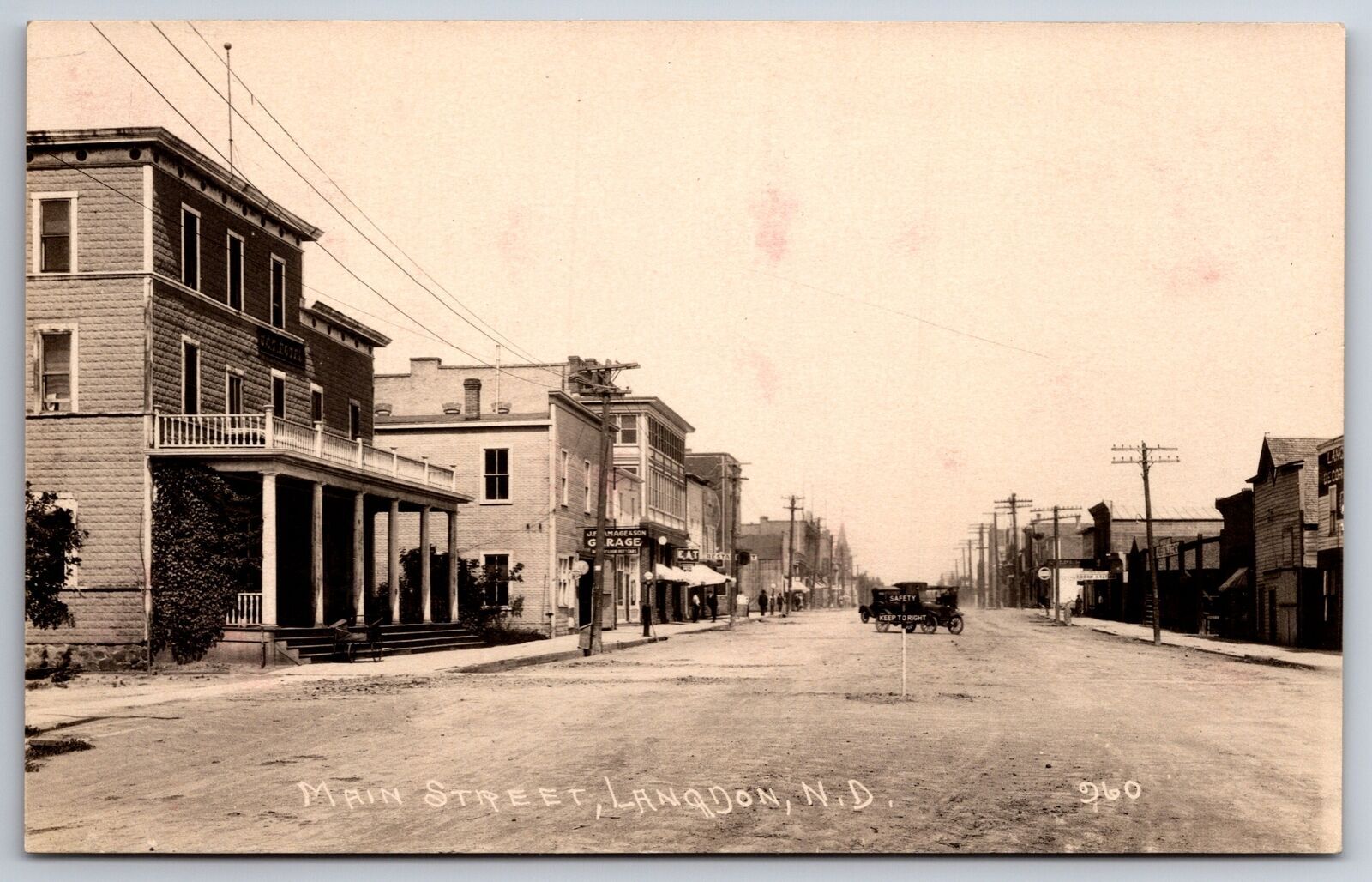 Langdon ND~Main Street~Ramage & Son Garage~Road Arrow~Keep to Right~1920 RPPC