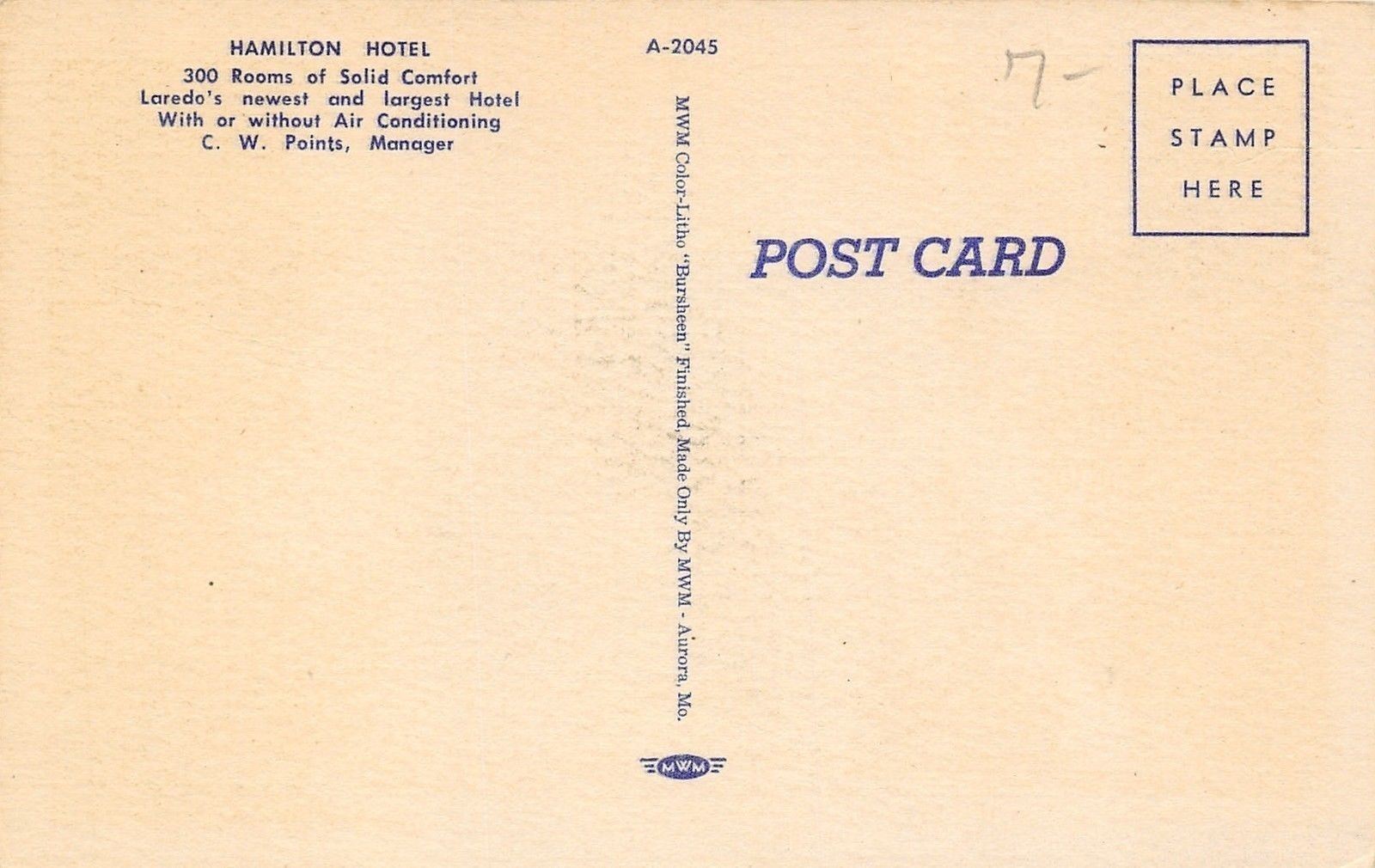 Laredo Texas~Hamilton Hotel~CW Points, Manager~1940s Linen Postcard