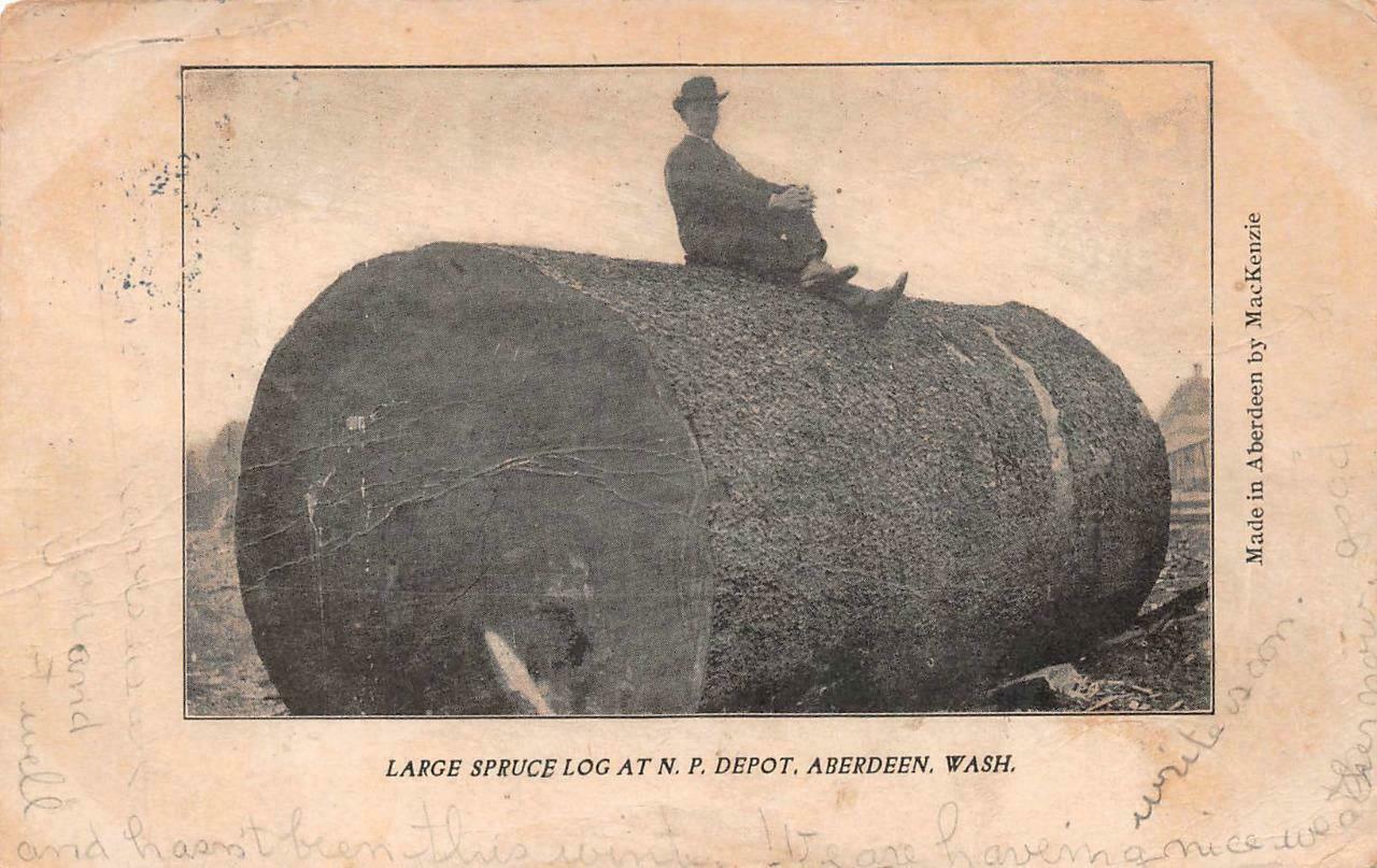 LARGE SPRUCE LOG AT N.P. TRAIN DEPOT ABERDEEN WASHINGTON POSTCARD 1908