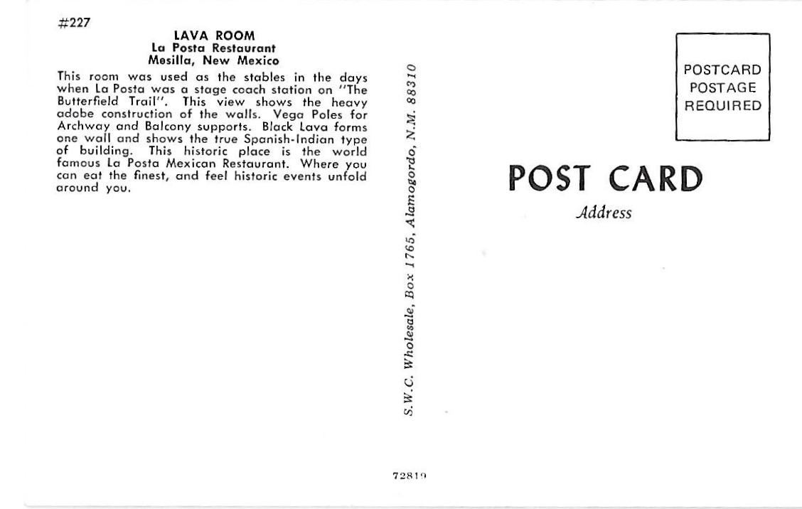 Lava Room La Posta Restaurant Mesilla New Mexico. Used to be a part of a stage stop on the Butterfield Trail and from personal experience, their food is yummy!Seller Information
