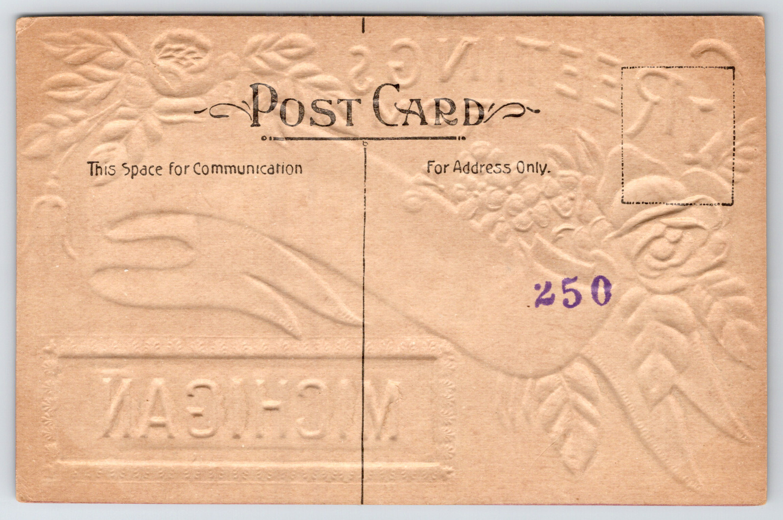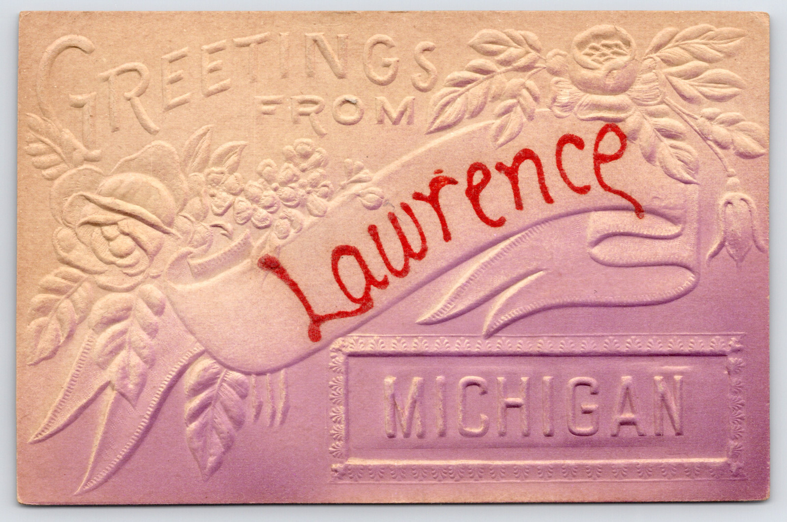 Lawrence Michigan~Embossed & Airbrushed Muted Raspberry Greetings c1909 Postcard