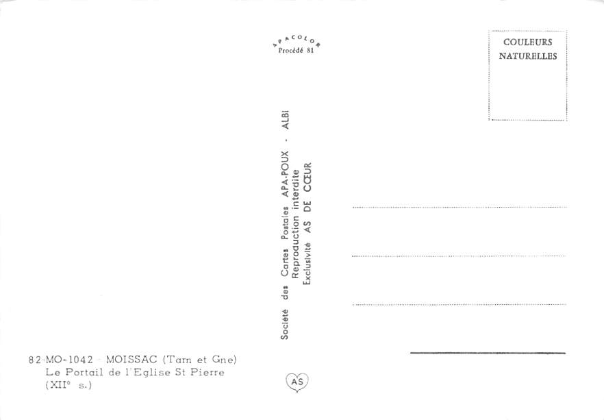 Le Portail de l'Eglise St Pierre - Moissac Grade: 2 Category: Continental Size Postcard, Approx 4 in x 6 in (10 cm x 15.25 cm) Product Size: Continental size: 4X6 inches (10.5 cm x 15 cm) Grading Scale: Grade ... Read More