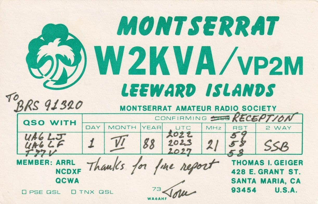 Leeward Islands Caribbean Montserrat Amateur Radio Society QSL Card