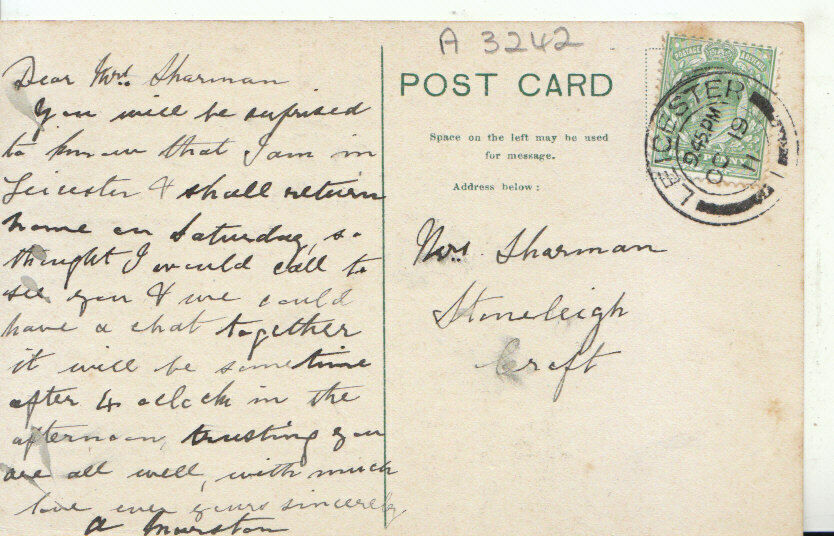 Mo's Postcards Postcard Description: Leicestershire Postcard - Abbey Park - Leicester Genealogy Information: Used - 1911 - Mrs Sharman - Stoneleigh - Croft Defects:Postage & Payment: For U.K residents ... Read More