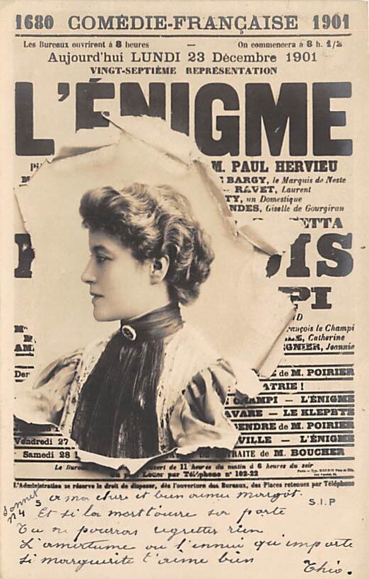 L'Engigme Theater Postcard PU Unknown, Grade: 4 - writing on front, , Size: Regular size: Approx 3 1/2 X 5 1/2 inch (9 cm X 14 cm) Grading Scale: Grade 1 = Perfect corners Grade 2 = Very Minimal corner wear, n ... Read More