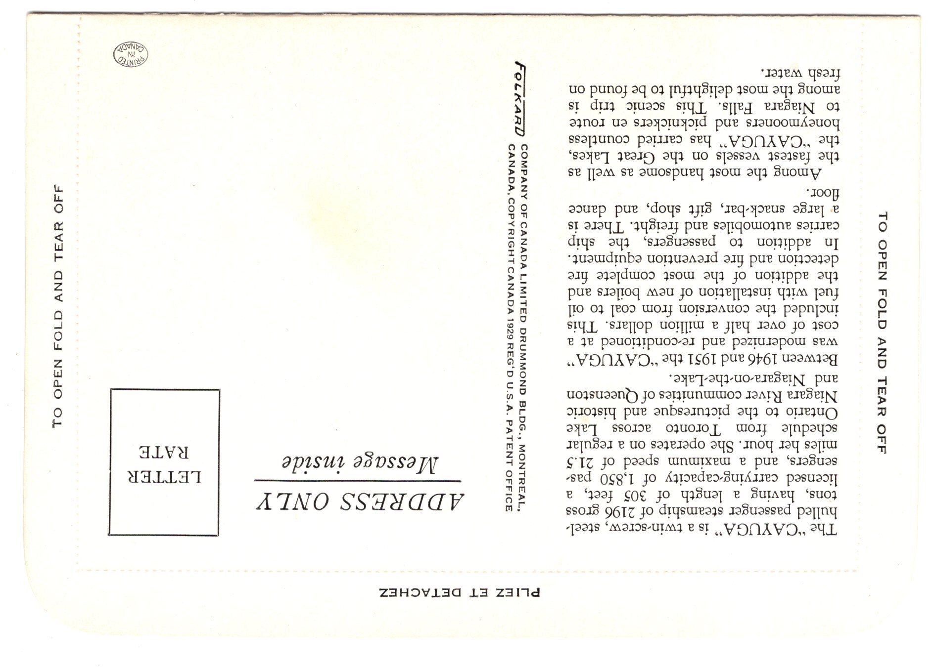 Letter card, SS Cayuga, Ontario, Folkard
