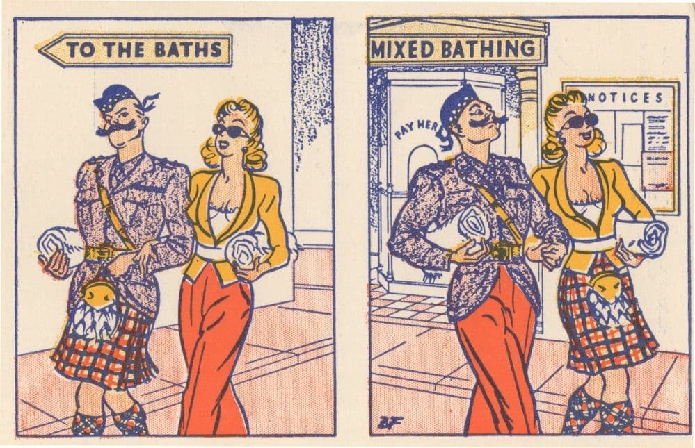 zx796 I cant add to the title - Just who is wearing the skirt with these two visitors to the mixed bathing section of the pools - Unknown for its time this postcard would today become political - Vintage origin unused and mint.
