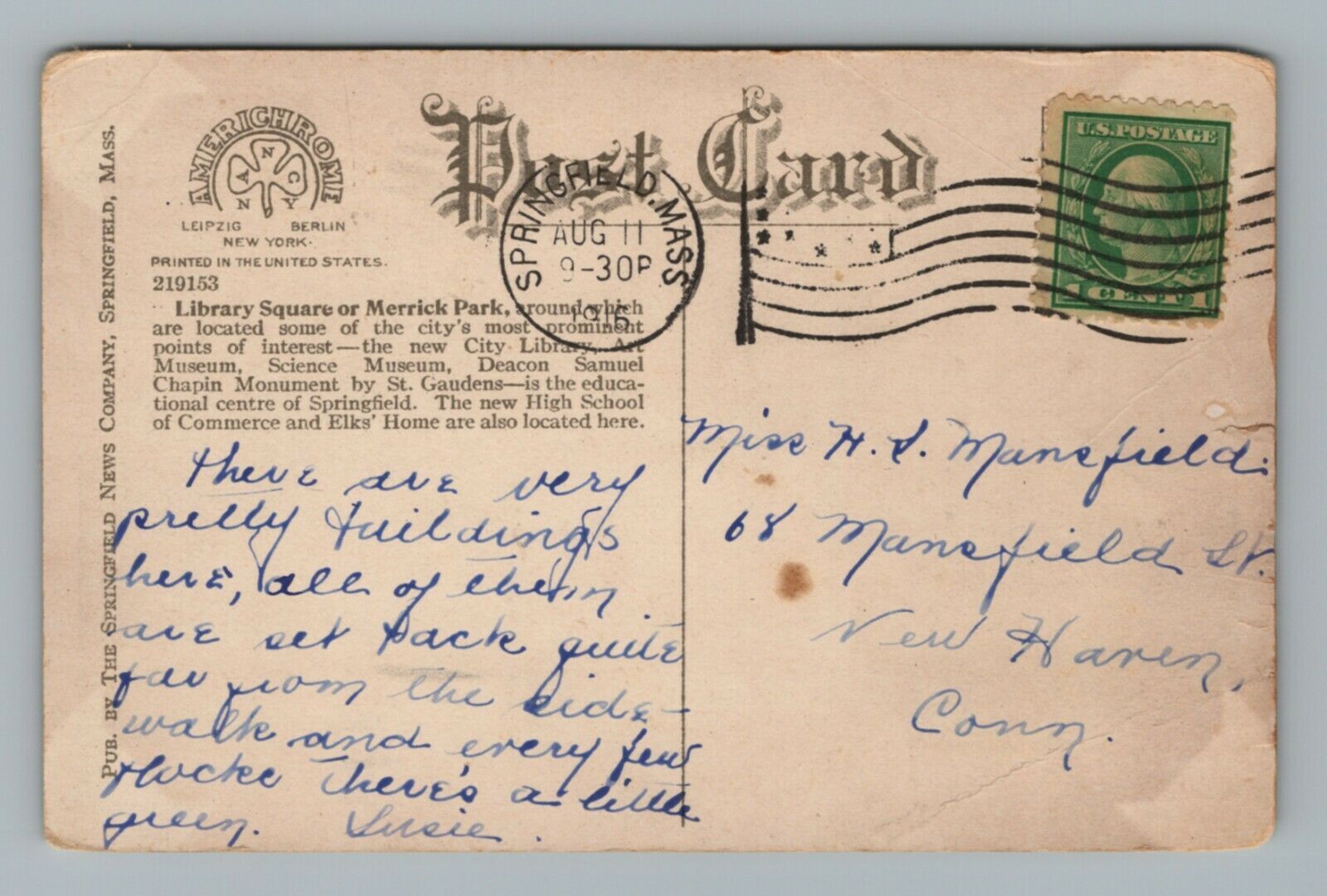 Library Square Springfield Massachusetts Building Names Vintage Postcard