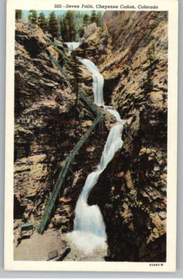 Linen Postcard--Seven Falls--Cheyenne Canyon-Colorado