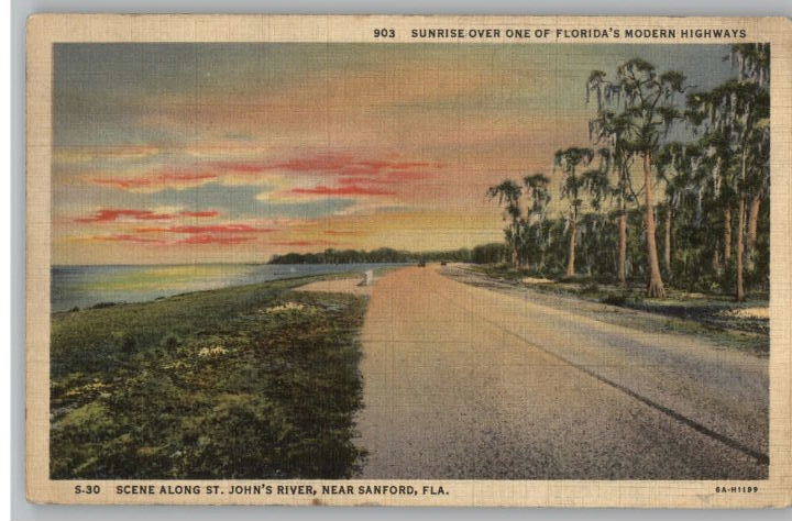 Linen Postcard-Sunrise..Highway..River-Sanford,Florida