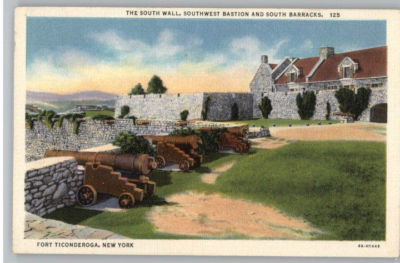 Linen Postcard..Cannons..South Wall..Barracks..Fort Ticon...
