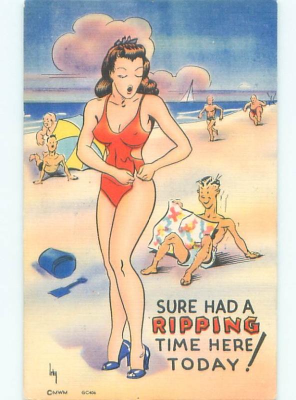 Linen Risque signed SEXY BEACH GIRL RIPS HER BATHING SUIT AB6821