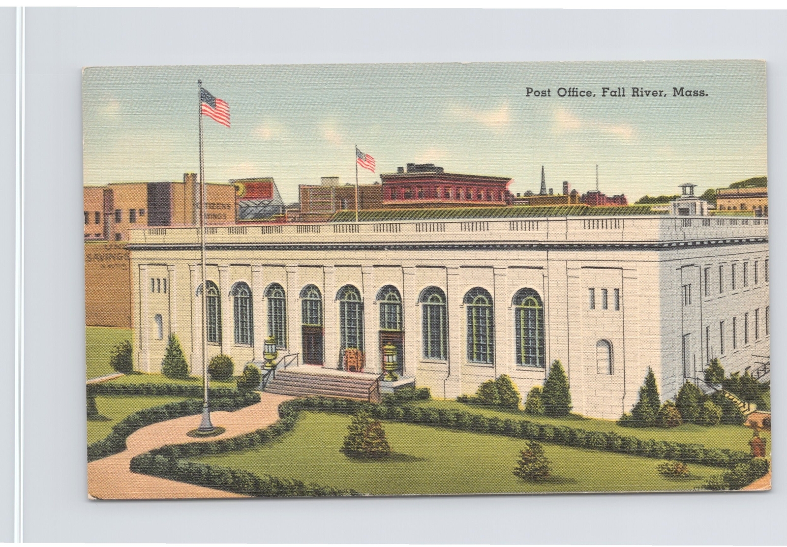 Linen~Air View Post Office @ Fall River Massachusetts~Vintage Postcard