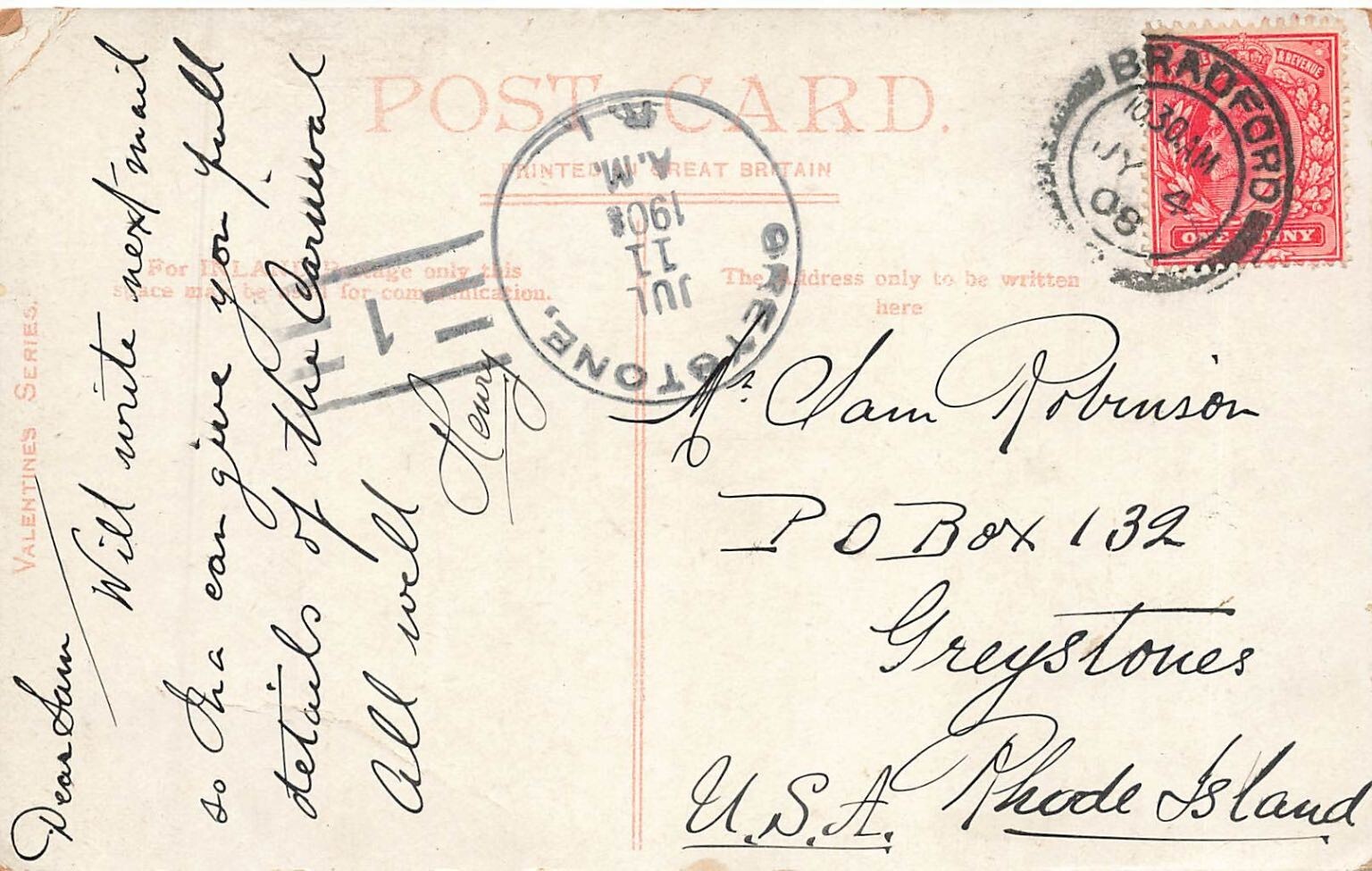 Discover a charming piece of early 20th-century British history with this vintage postcard featuring Lister Park in Bradford, England. The scene depicts a prominent statue situated at a fork in a tree-lined path, capturing the serene beauty of this historic park. This finely printed postcard showcases the architectural and natural splendor of Bradford, offering a glimpse into the past.Published as part of the renowned Valentine's Series, this postcard was postmarked in Bradford on July 8, 1908, and sent to Rhode Island, USA. The divided back design is characteristic of postcards from this era, making it a valuable addition for collectors of Bradford memorabilia, English history, or early 20th-century postcard art. The detailed imagery and historical context make this a truly unique collectible.