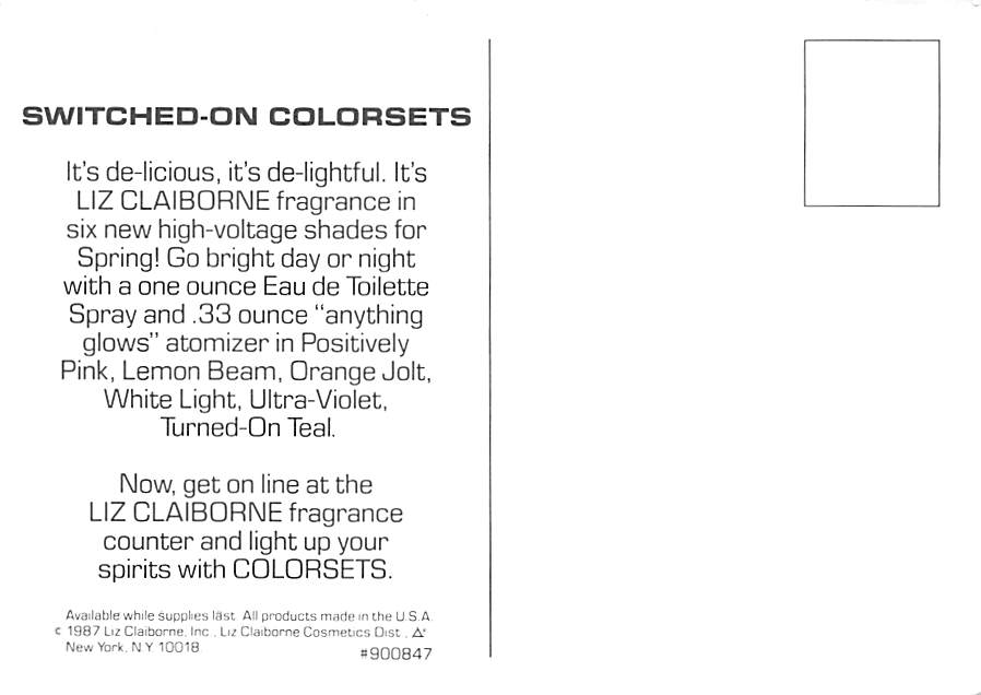 Liz Claiborne - Grade: 1 Category: Continental Size Postcard, Approx 4 in x 6 in (10 cm x 15.25 cm) Product Size: Continental size: 4X6 inches (10.5 cm x 15 cm) Grading Scale: Grade 1 = Perfect corners Grade 2 ... Read More