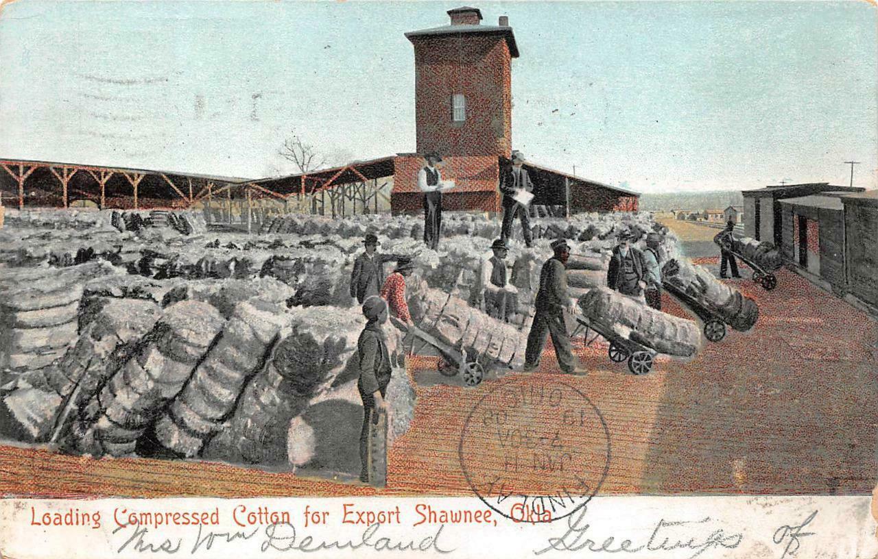 Loading compressed cotton for export shawnee oklahoma black americana postcard