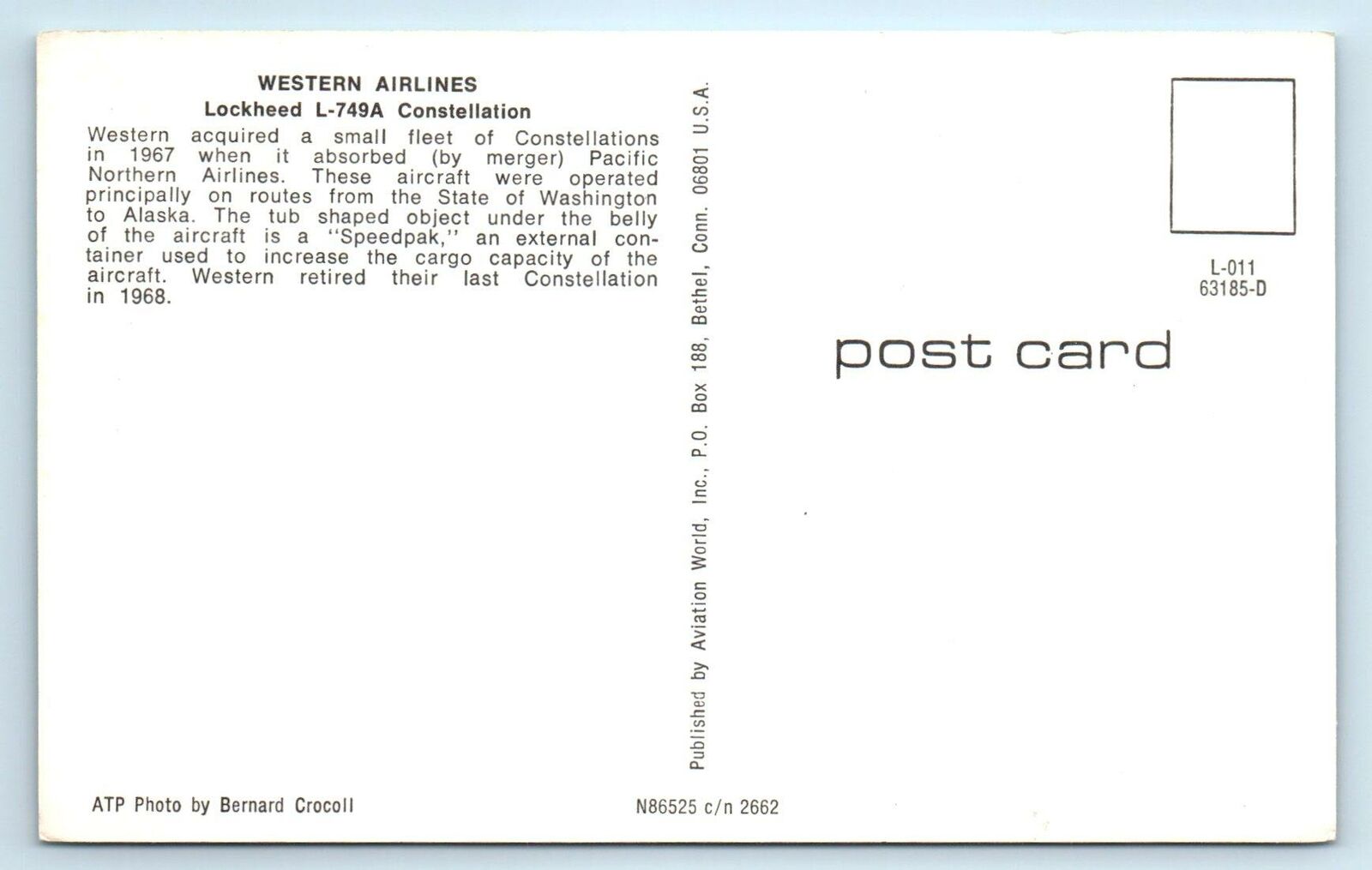 LOCKHEED L-749A CONSTELLATION AIRPLANE Western Airlines c1970s Postcard