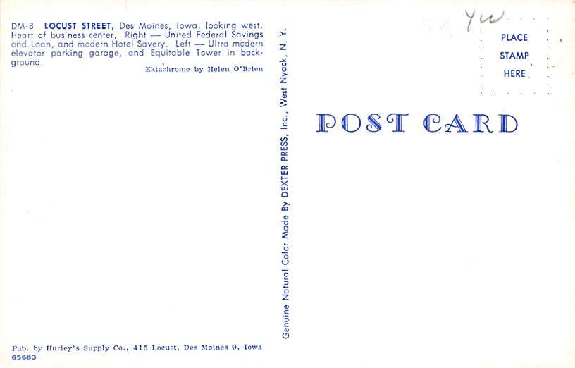 Locust Street Des Moines, Iowa Postcard - Unused Grade: 1 Size: R - Regular size: Approx 3 1/2 X 5 1/2 inch (9 cm X 14 cm) Grading Scale: Grade 1 = Perfect corners Grade 2 = Very Minimal corner wear, no crease ... Read More