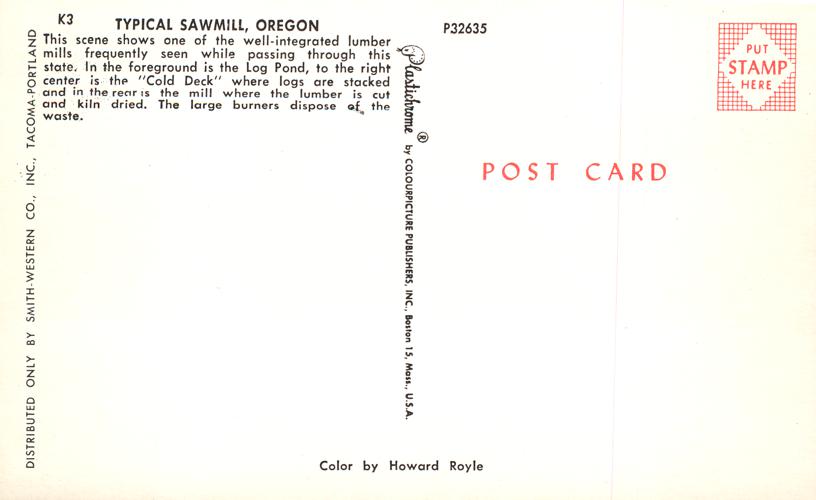 Log Pond and Kiln at Typical Sawmill, Oregon. Standard sized chrome card. Excellent condition.
