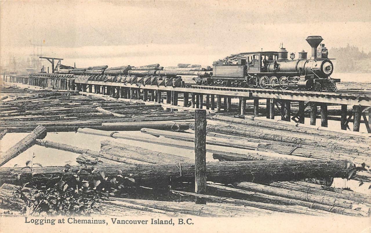 LOGGING AT CHEMAINUS VANCOUVER ISLAND BRITISH COLUMBIA CANADA TRAIN POSTCARD