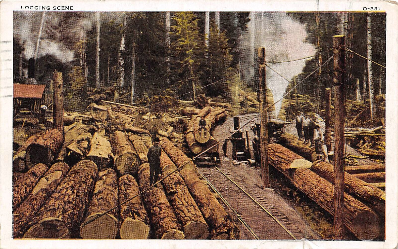 Logging Scene Donkey Engine Railroad Cars Train Washington 1930 postcard