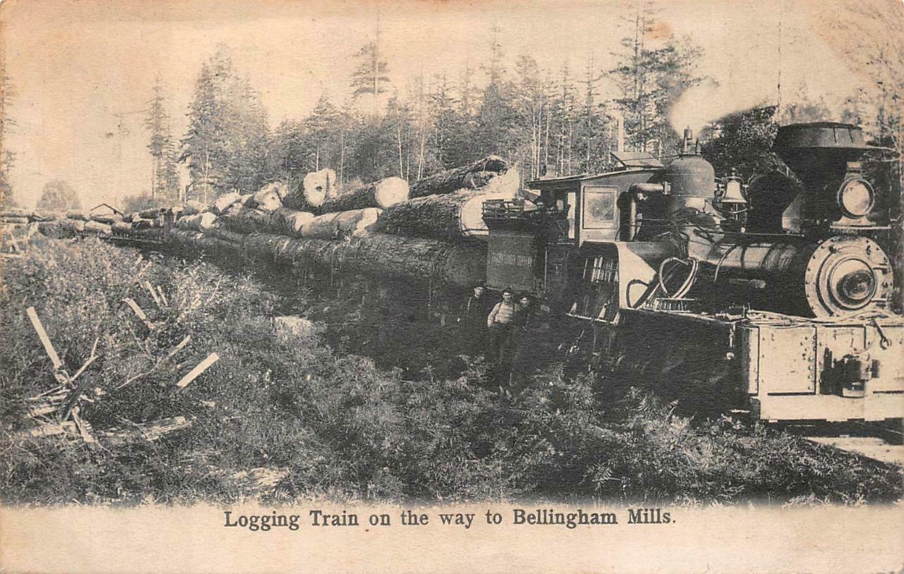 LOGGING TRAIN ON THE WAY TO BELLINGHAM MILLS WASHINGTON POSTCARD 1908