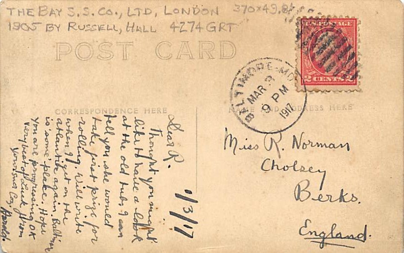 London Bay SS Co Ship Postcard 1917, Grade: 3 - real photo Size: Regular Size Postcard - approximately 3 1/2 inch x 5 1/2 inch (9 CM x 14 CM) Grading Scale: Grade 1 = Perfect corners Grade 2 = Very Minimal corn ... Read More