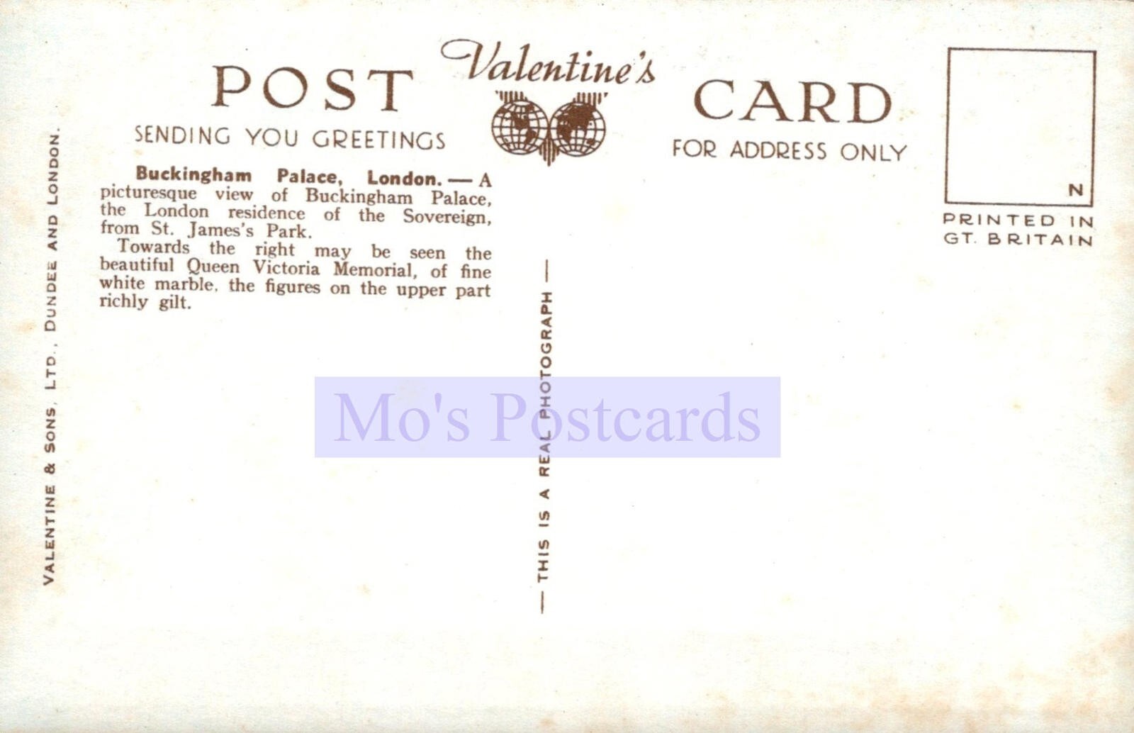 This is a London Postcard - Buckingham Palace SW20063 Publisher: Valentine & Sons - Real PhotoPostcard size: Standard. Unused Defects: Please also use the image magnifier to make your own assessment on the condition. Please ignore any lines caused by the scanner. When possible all of our postcards will be posted to you inside a collectable plastic postcard sleeve and a board backed envelope which will be marked 'Please do not bend'.The 'Mo's Postcards' watermark does not appear on the actual postcard'. Mo's Ref: London Postcard - Buckingham Palace SW20063