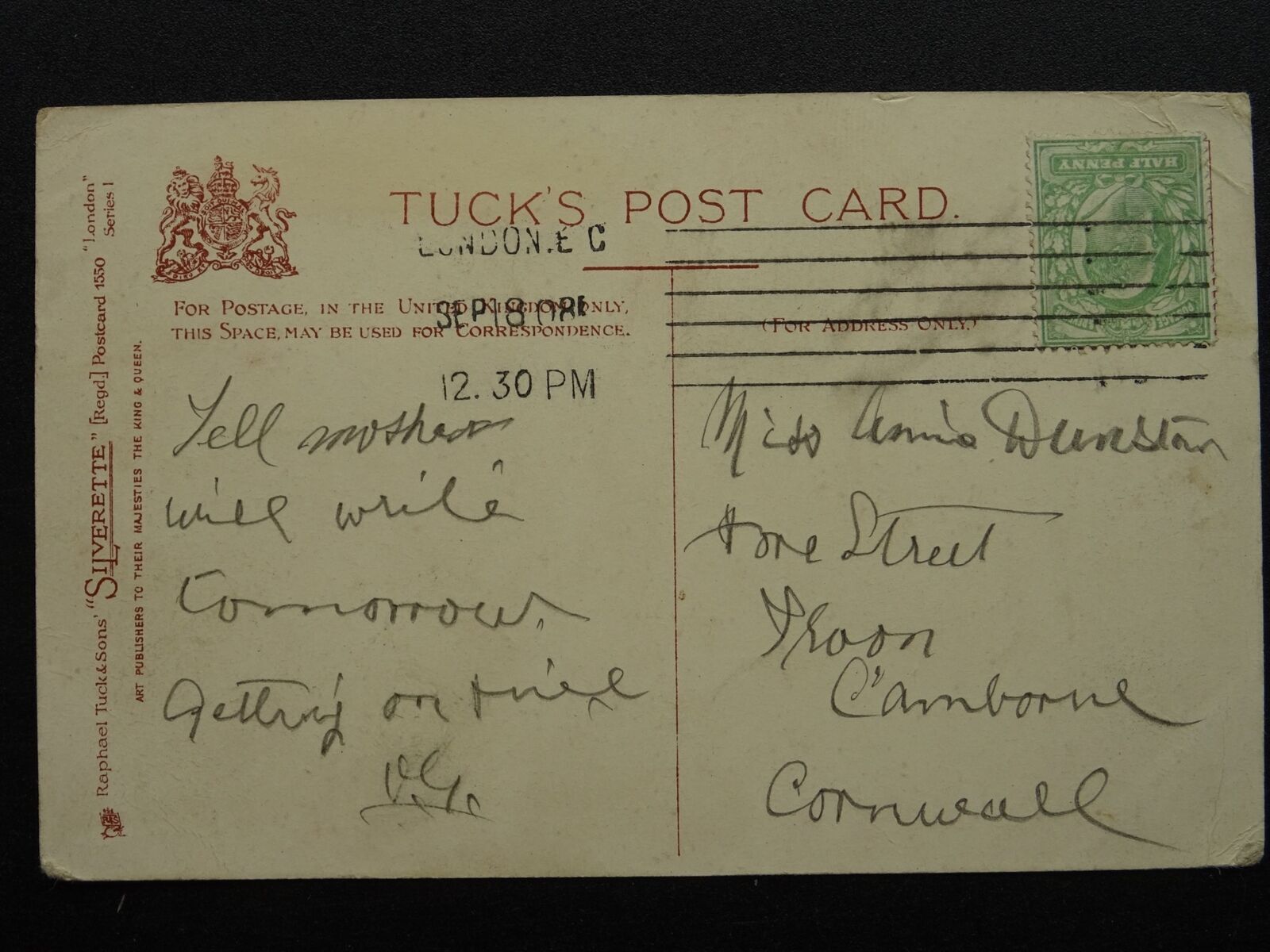 London WATERLOO PLACE c1904 Postcard by Raphael Tuck 1550 London WATERLOO PLACE c1904 Postcard by Raphael Tuck 1550 Postcard Details Additional Information - Postcard Condition (VG) - Very Good / corner bend top left / corner bumpsPostally - used / Postcard Details - Please see detail on the photographic image or contact us for details. Abbreviations: (UB) Undivided Back / (RP) Real Photograph Postcard / (PM) Postmark Interest / (CDS) Cancellation Date Stamp / (SQC) Squared Circle / (DP) Duplex PostmarkPTP Reference - 070422 Postcards WelcomeWelcome to our store. At Past Time Postcards we stock a comprehensive range of British antique and vintage topographical postcards, cigarette cards, rare antique prints and other antique collectables.We aim to make your shopping experience enjoyable and stress free. We list our postcards topographically and by subject matter to make it easier for you to locate the items that interest you. Feel free to browse and explore at your leisure, however if you require assistance locating items or have a specific request please don't hesitate to contact us.Combined Postage We will always combine postage when you purchase multiple items. Please make your multiple purchases by using your Hip BASKET where postage will be combined automatically.Postage & PackagingPostage rates are calculated to include postage and packaging. All Full Sets of Cigarette or Trade Cards are posted 1st Class and protected with a plastic sleeves in a BOARD BACKED ENVELOPE & FULL SET HAVE ADDED STIFFNER BOARD for added security and protection. Payment MethodsOur preferred method of payment is through PayPal for all purchases.UK CUSTOMERS can make payment by PayPal, Personal Cheque or Postal Order. PLEASE NOTE: Credit cards included in PayPal payment method Inc. Visa, MasterCard, American Express, Discover. FOR CUSTOMERS OUTSIDE THE UK: we can only accept PayPal as method of payment100% SatisfactionIf in the unlikely event you are unhappy with your item you have purchased on the basis that the postcard was incorrectly described or graded we do offer a complete refund less the cost of postage and packaging once the item is returned to us.Condition & Grading Information(M) Mint – Like new, almost perfect(EX) Excellent – No obvious flaws, sharp corners, clean and if postally used the writing does not detract from appearance.(VG) Very Good - Minor defects such as album marks, signs of age and handling is acceptable that do not detract from appearance.(G) Good – Noticeable defects, handling and wear apparent. Minor creasing or minor postal damage not detrimental to image.(F) Fair – Obvious creasing, staining, small tears or damp damage evident. Significant edge or corner damage.(P) Poor – Incomplete or image seriously affectedFinally if you have any specific requests or questions we are always very pleased to offer support and assist you with your collecting needs.Kind regardsMark - Past Time Postcards Listing and template services provided by inkFrog